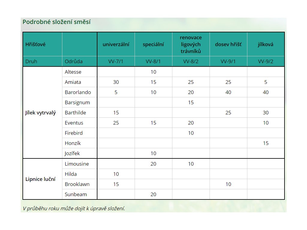 VV-4/3 rekreační směs tmavá nahradila v sortimentu směsí dosud používanou směs VV-6/3, od které se liší především zvýšeným zastoupením tmavých odrůd jílku vytrvalého (40%). Nová směs má rychlejší vývoj po zásevu a vytváří barevně vyrovnanější tmavý trávník.